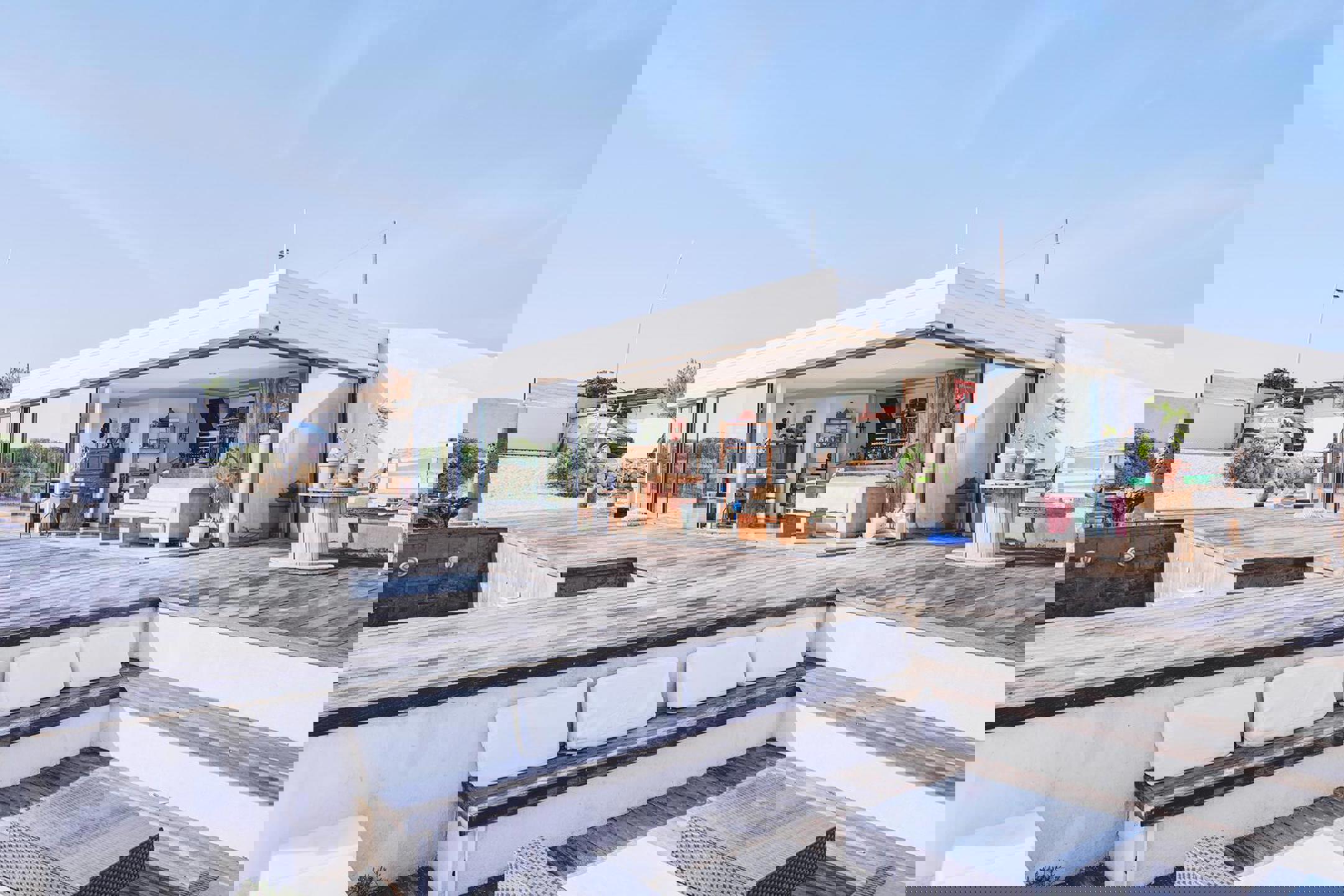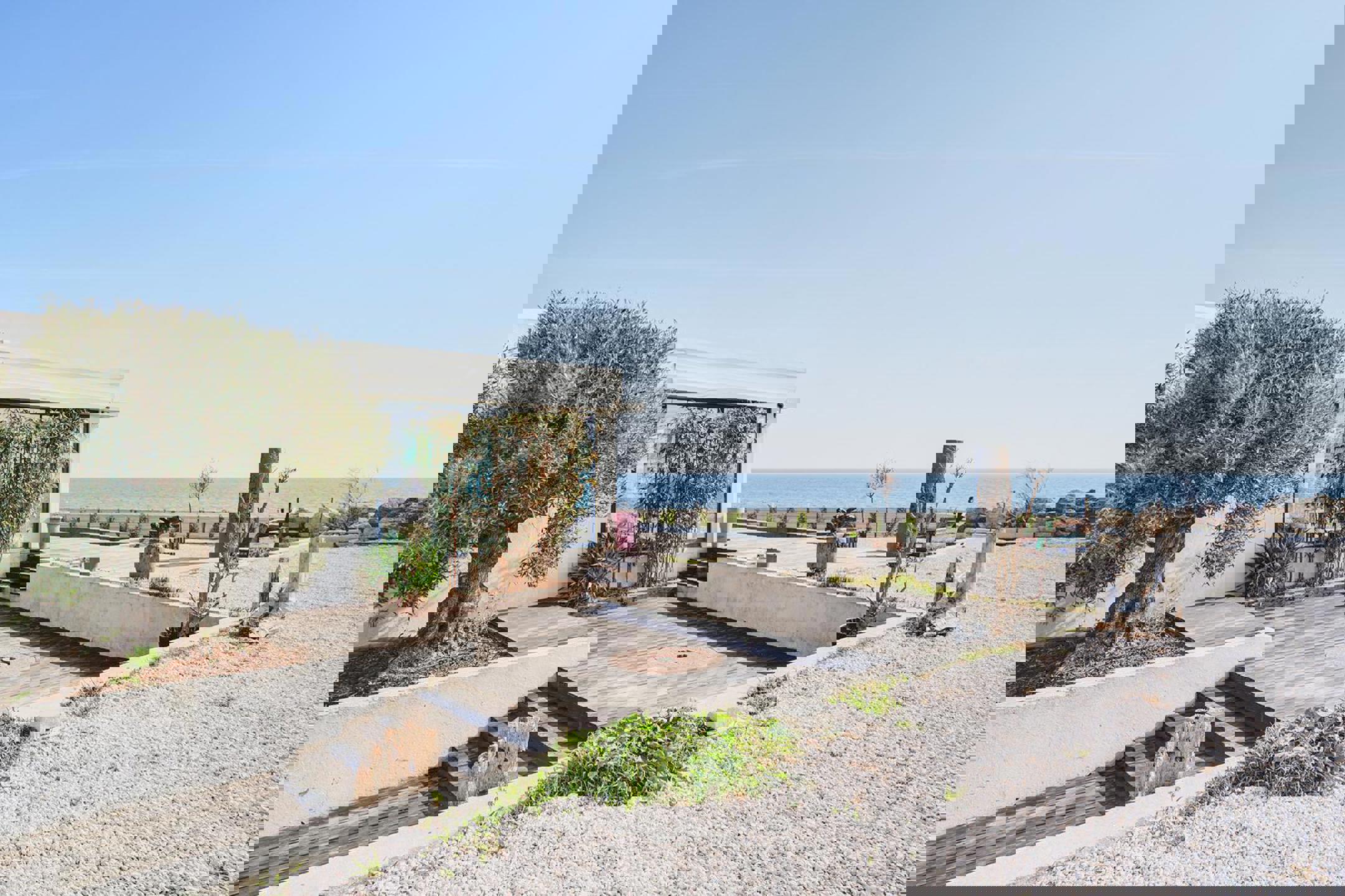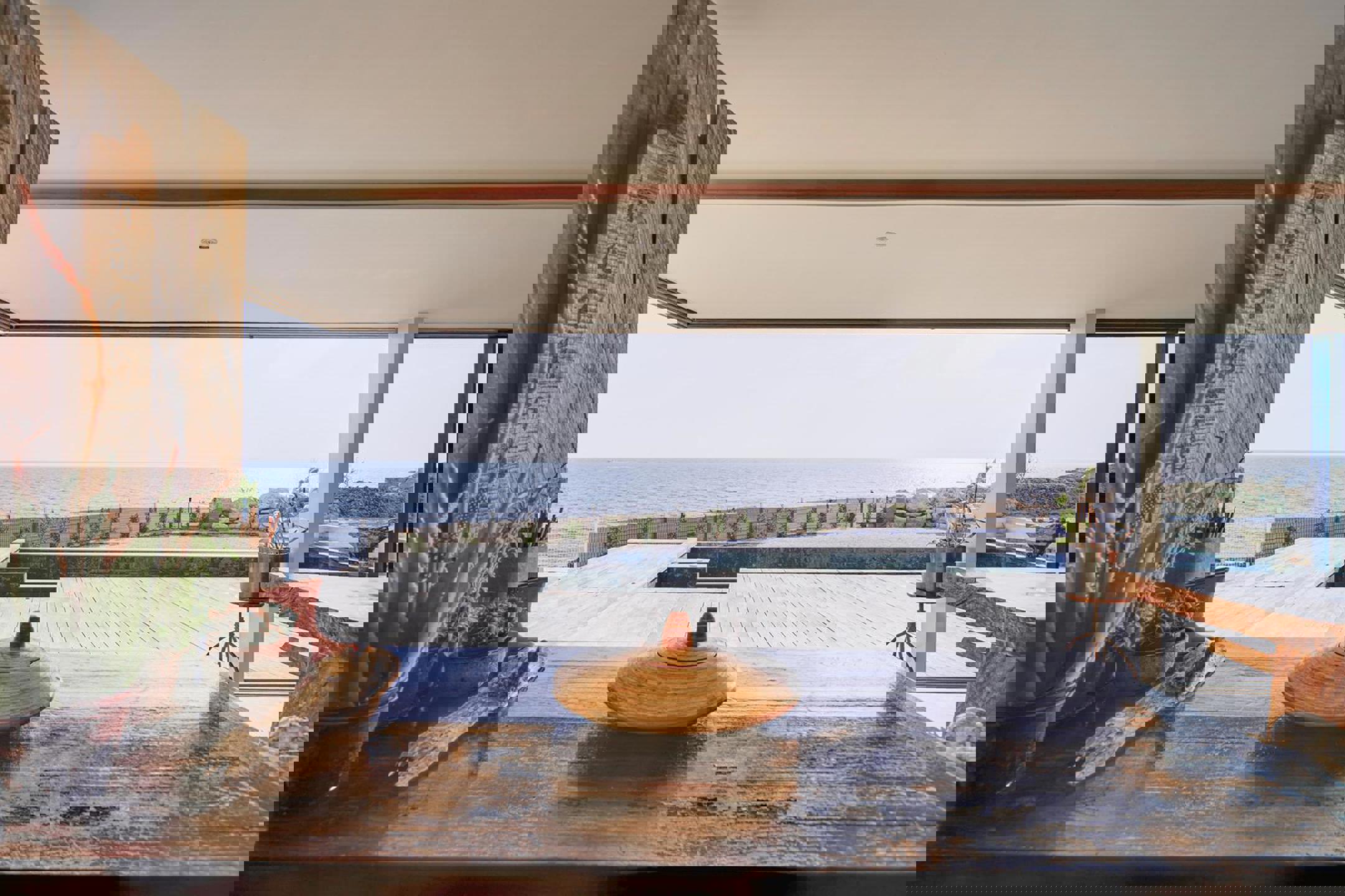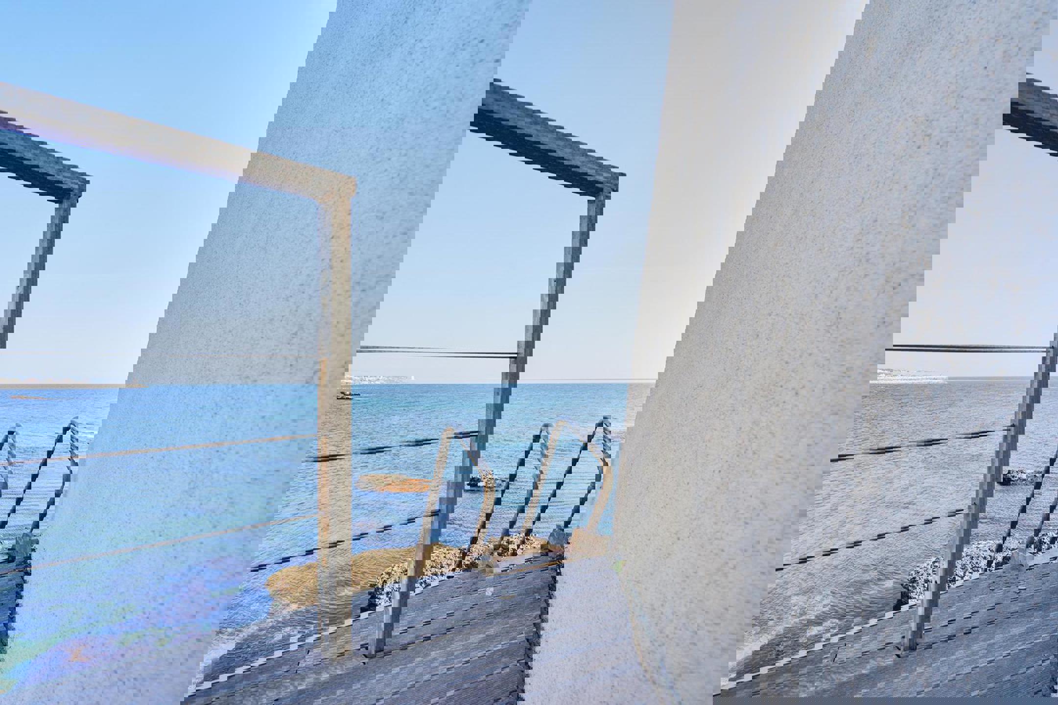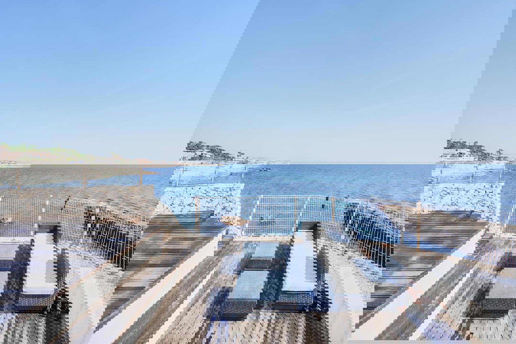 Depuis la terrasse de 300 m², admirez la vue imprenable sur la mer Méditerranée et détendez-vous dans la piscine avec jacuzzi intégré, remplie d'eau de mer pompée d'un puits à 62 mètres de profondeur.