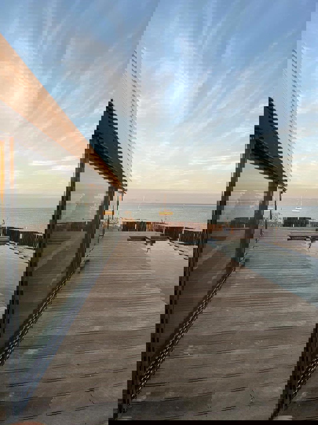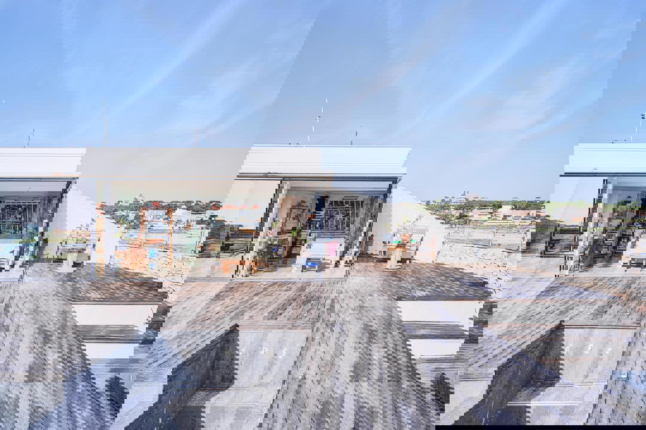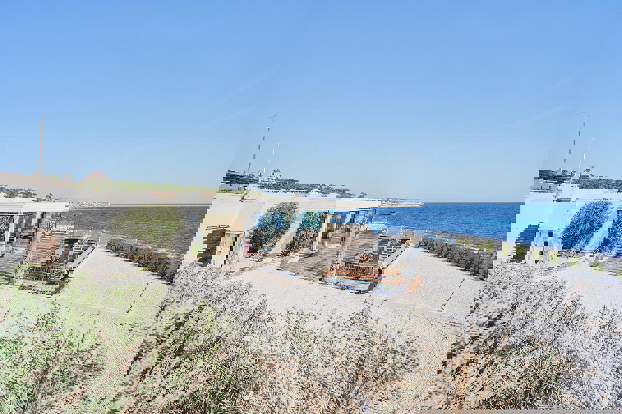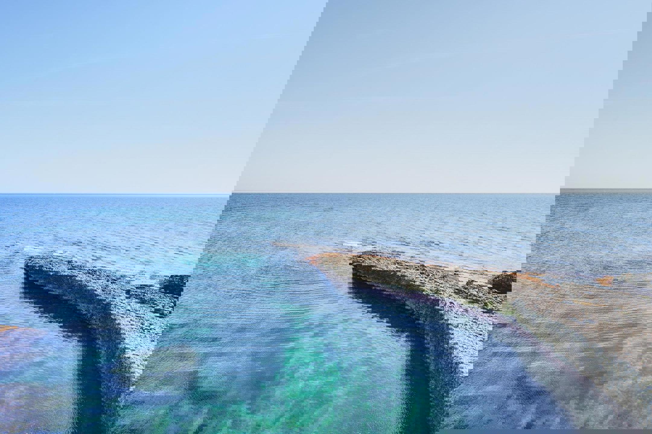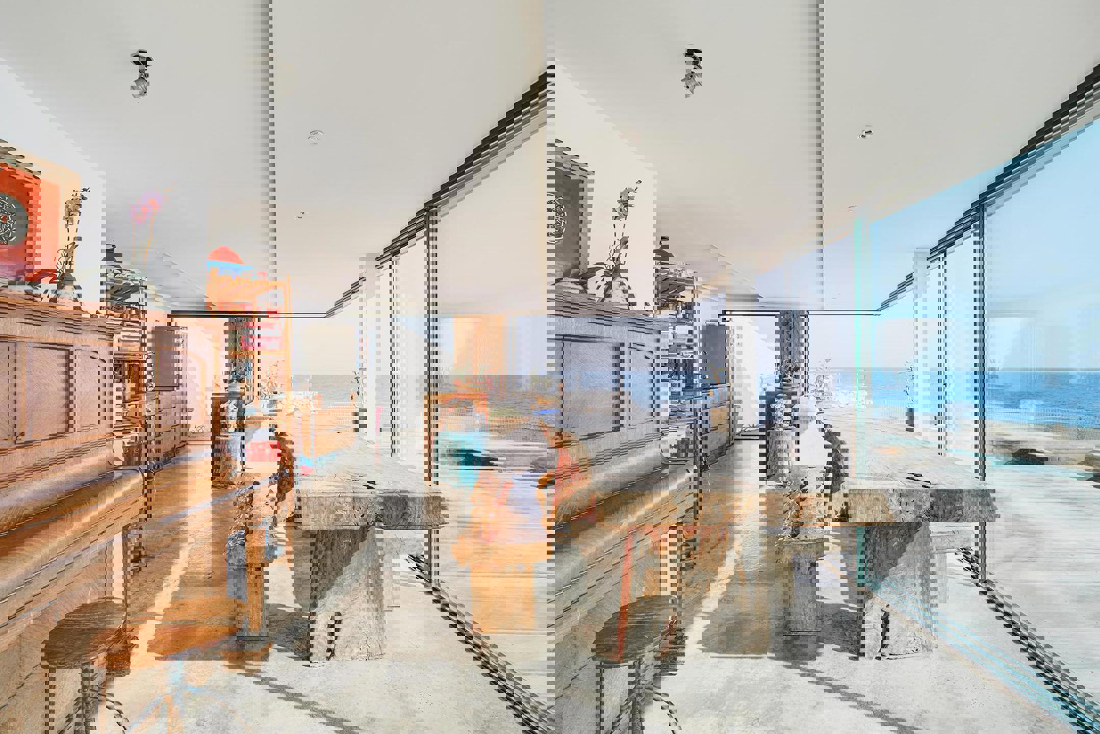 Depuis la terrasse de 300 m², admirez la vue imprenable sur la mer Méditerranée et détendez-vous dans la piscine avec jacuzzi intégré, remplie d'eau de mer pompée d'un puits à 62 mètres de profondeur.