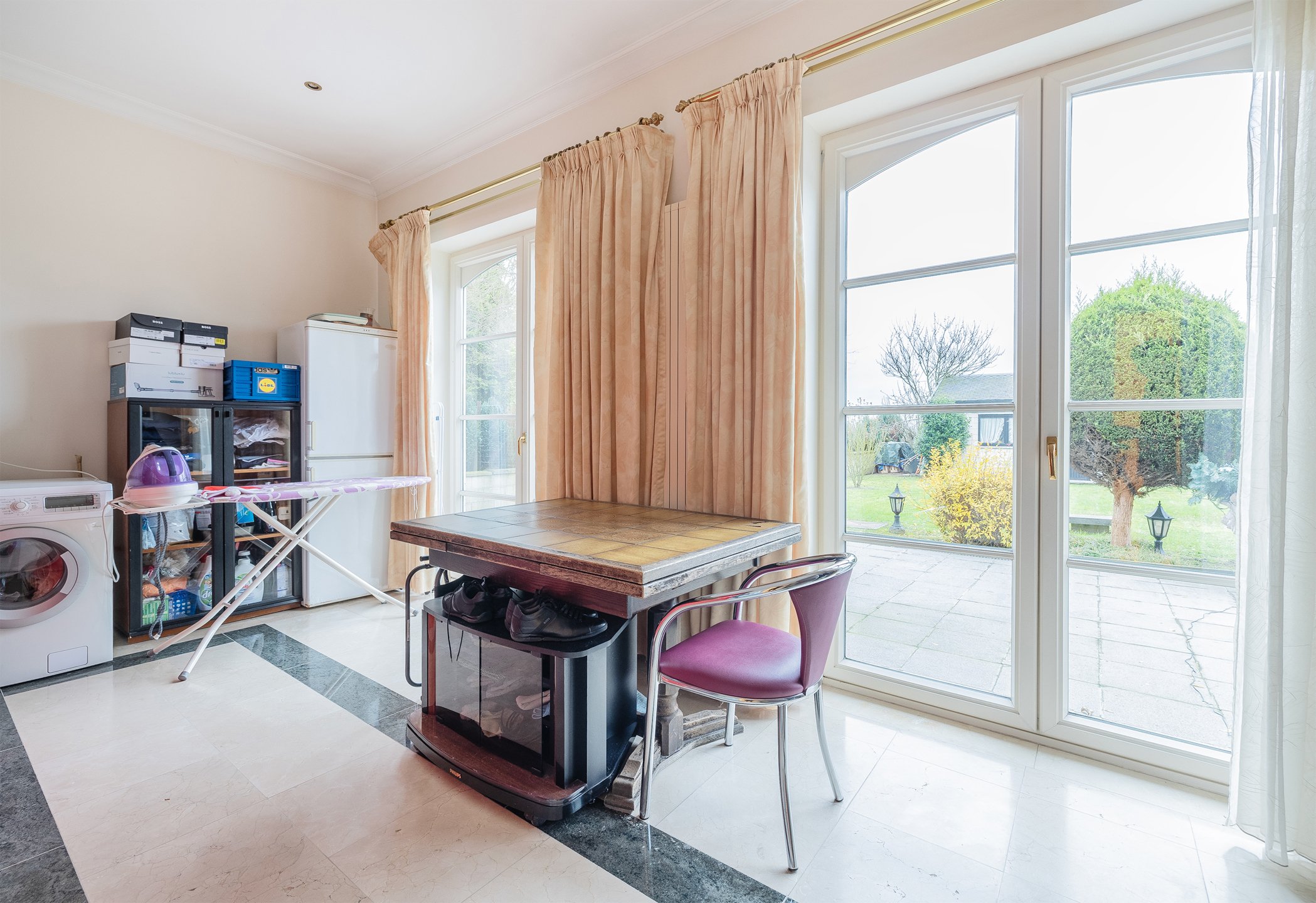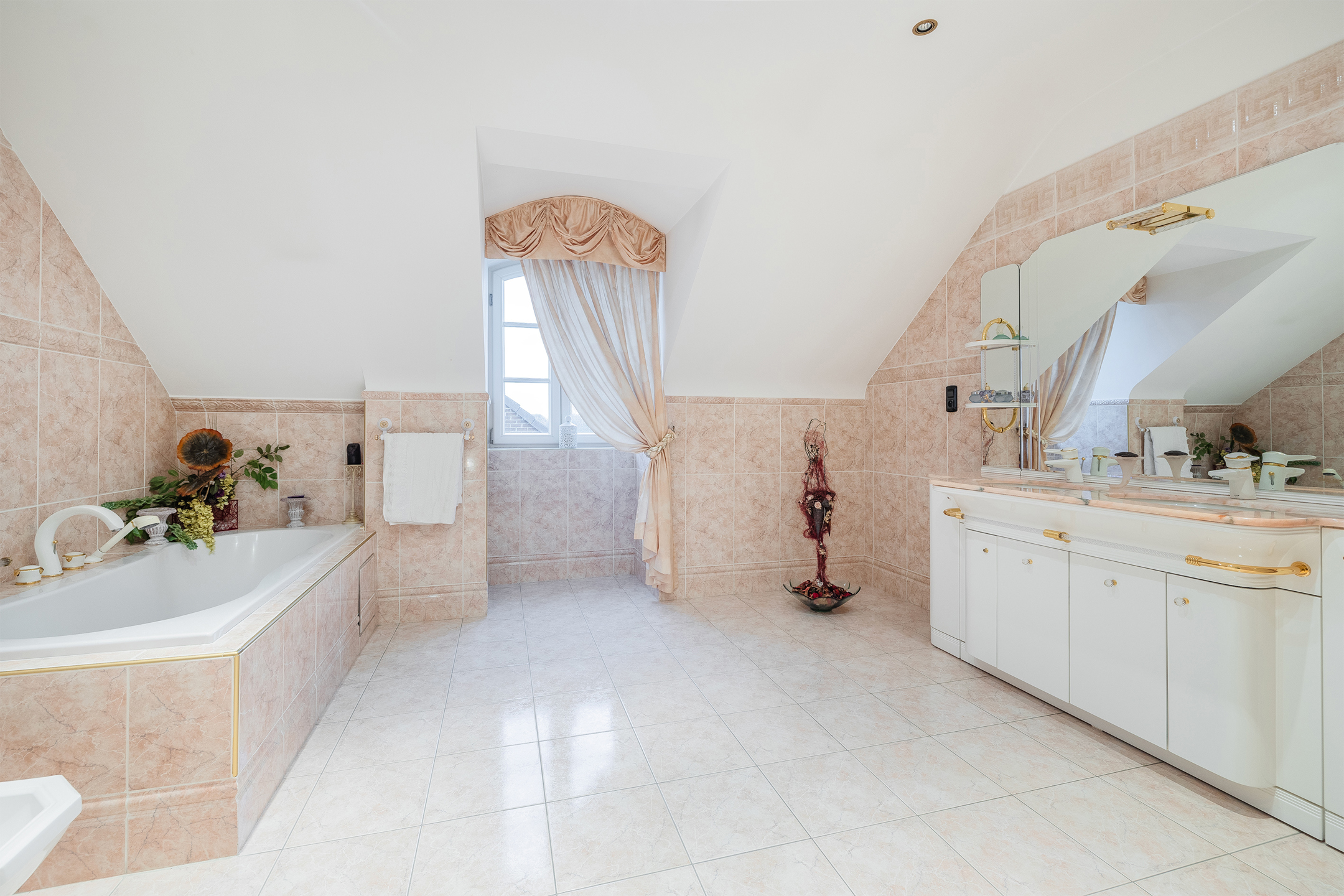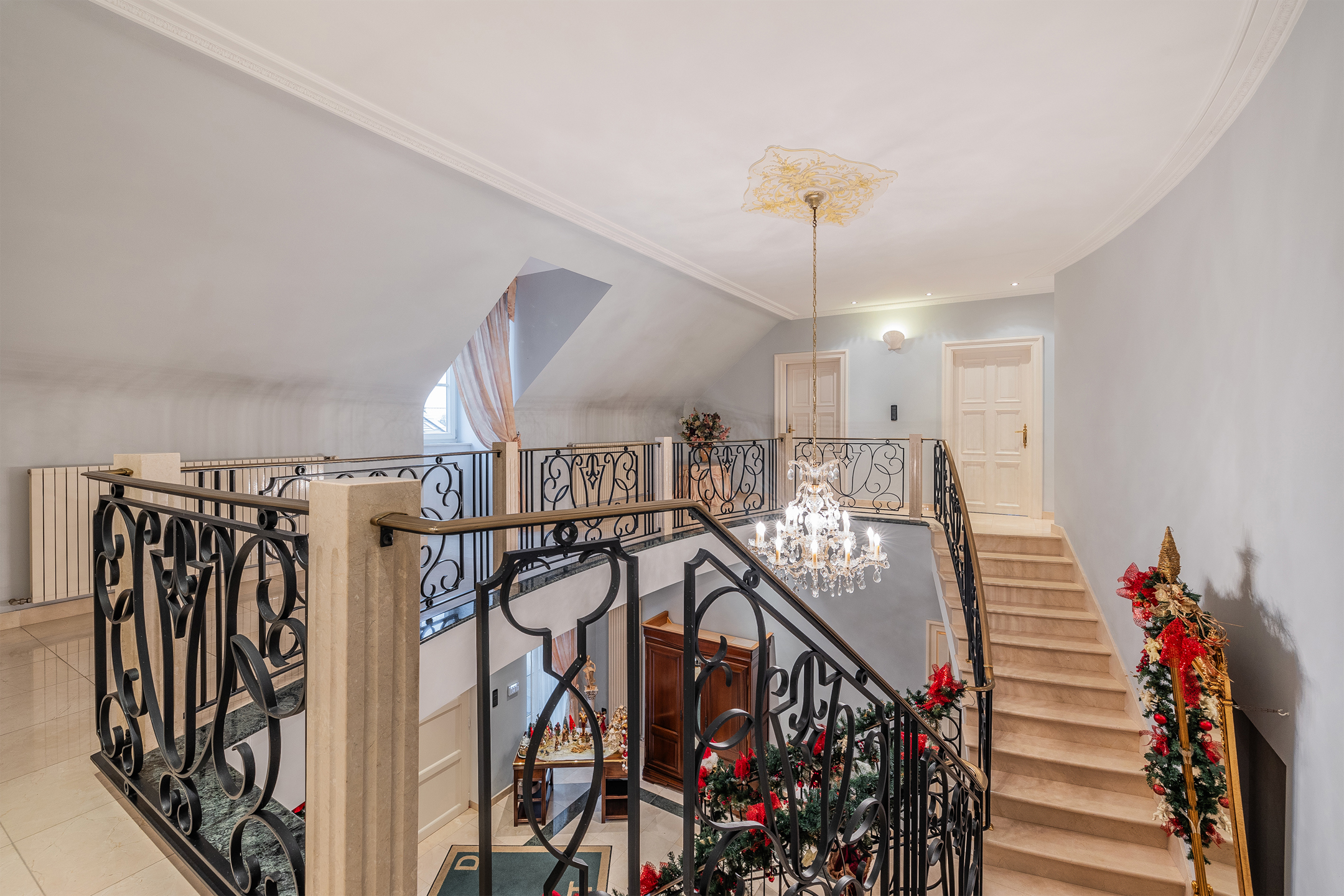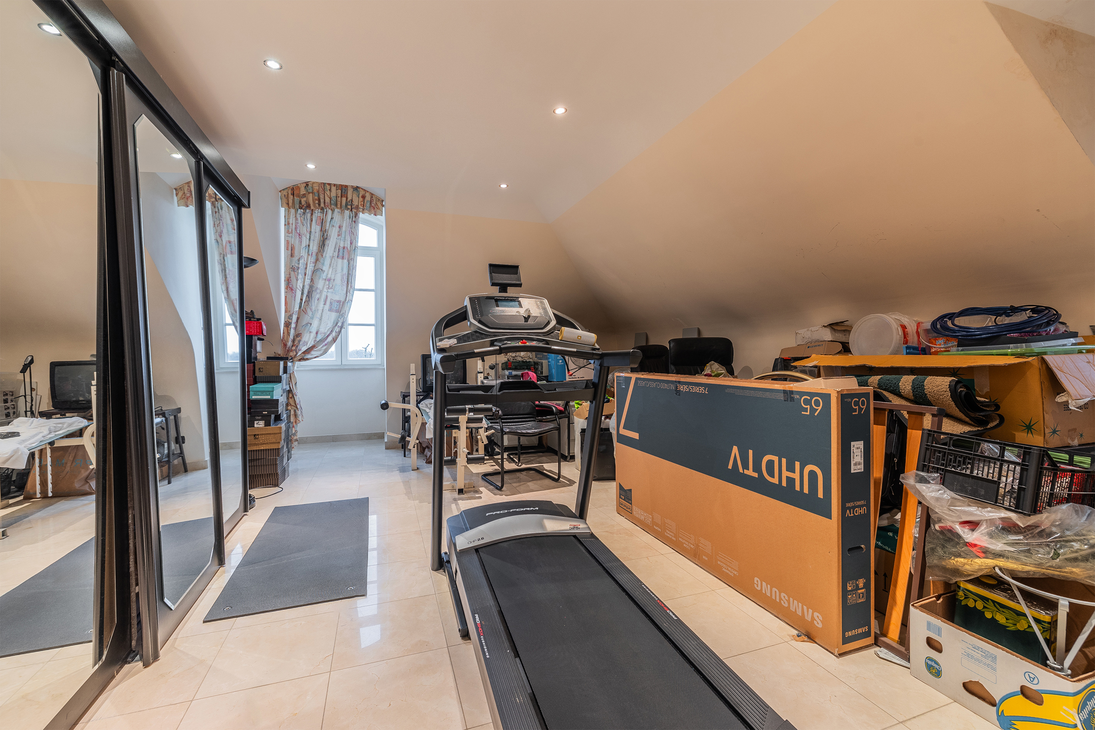 Le rez-de-chaussée vous accueille par un hall d'entrée majestueux avec un escalier bifurqué en pierre naturelle. Vous y trouverez un vaste living de 60 m² équipé d'une climatisation et d'une cassette au feu de bois, une grande cuisine Siematic super équipée orientée sud-ouest, un bureau séparé, une buanderie, une salle de bains avec baignoire, douche, WC, bidet et double vasque, ainsi qu'un WC indépendant. Un garage double avec portes automatiques complète ce niveau.