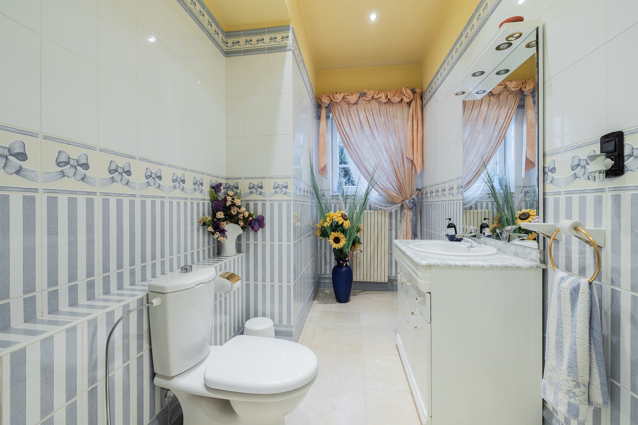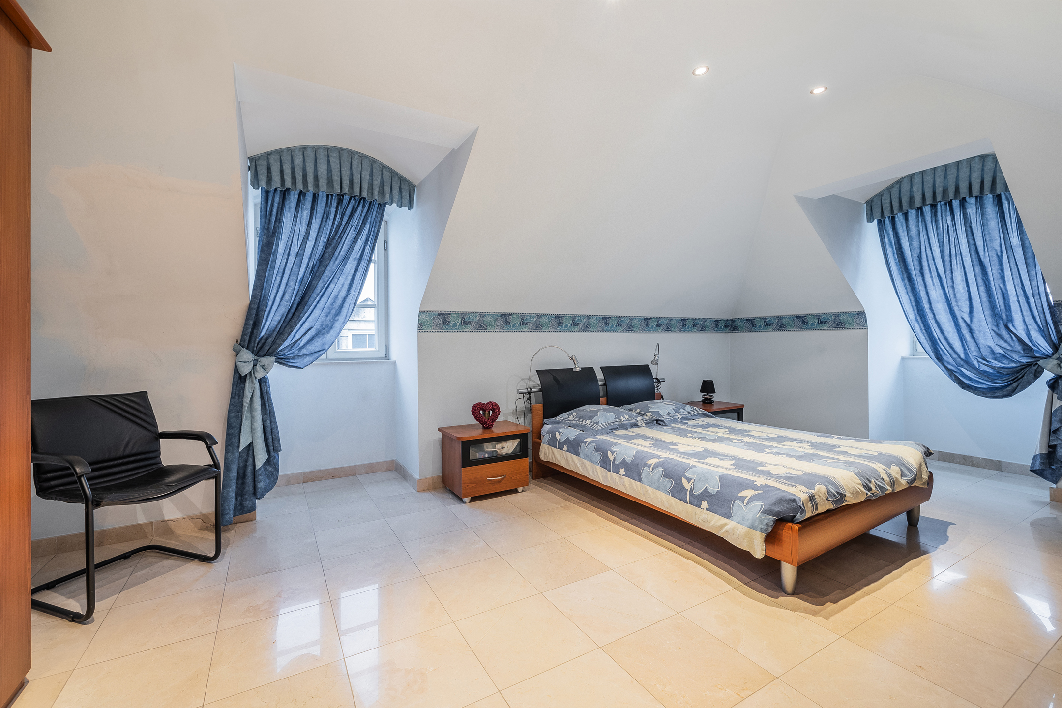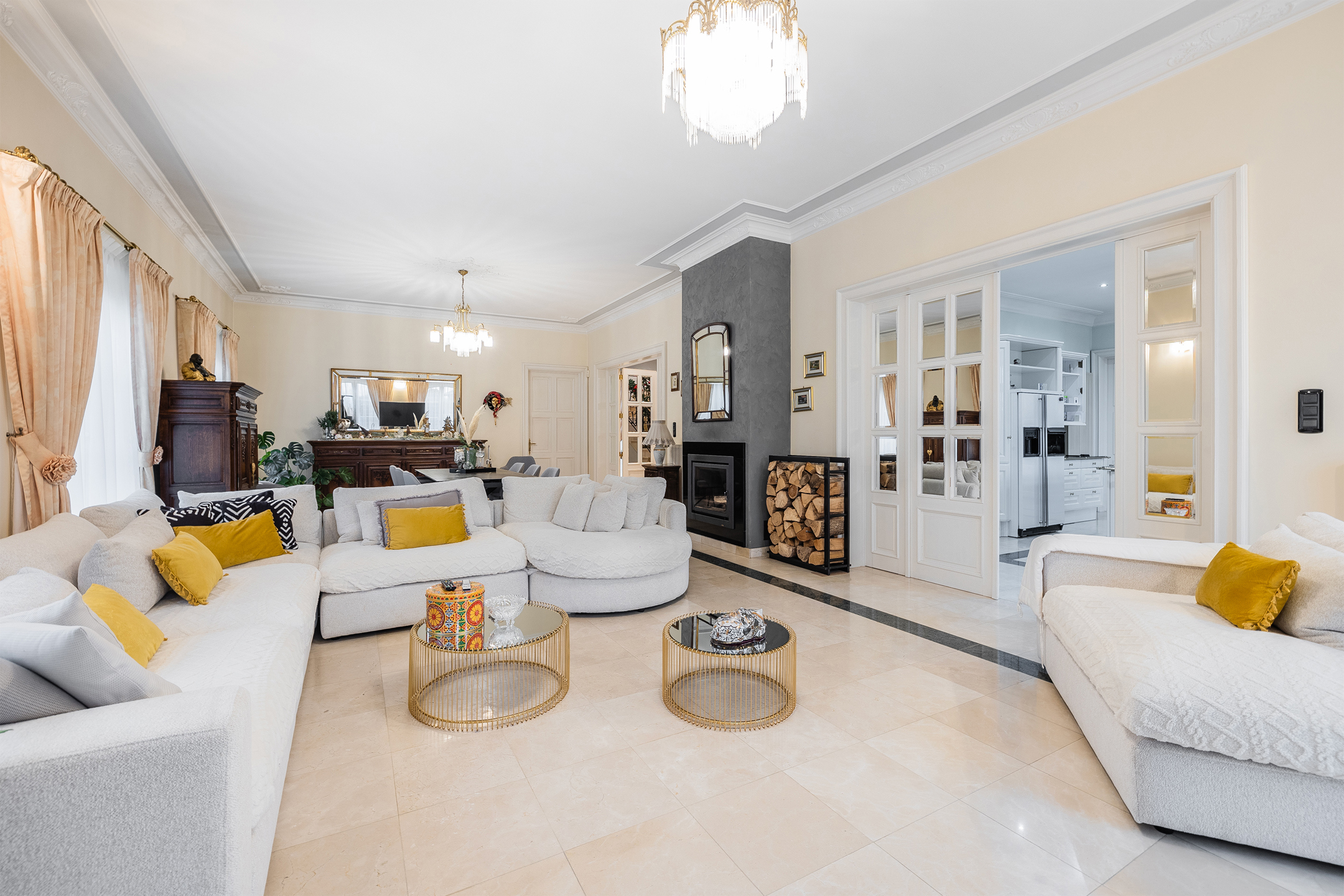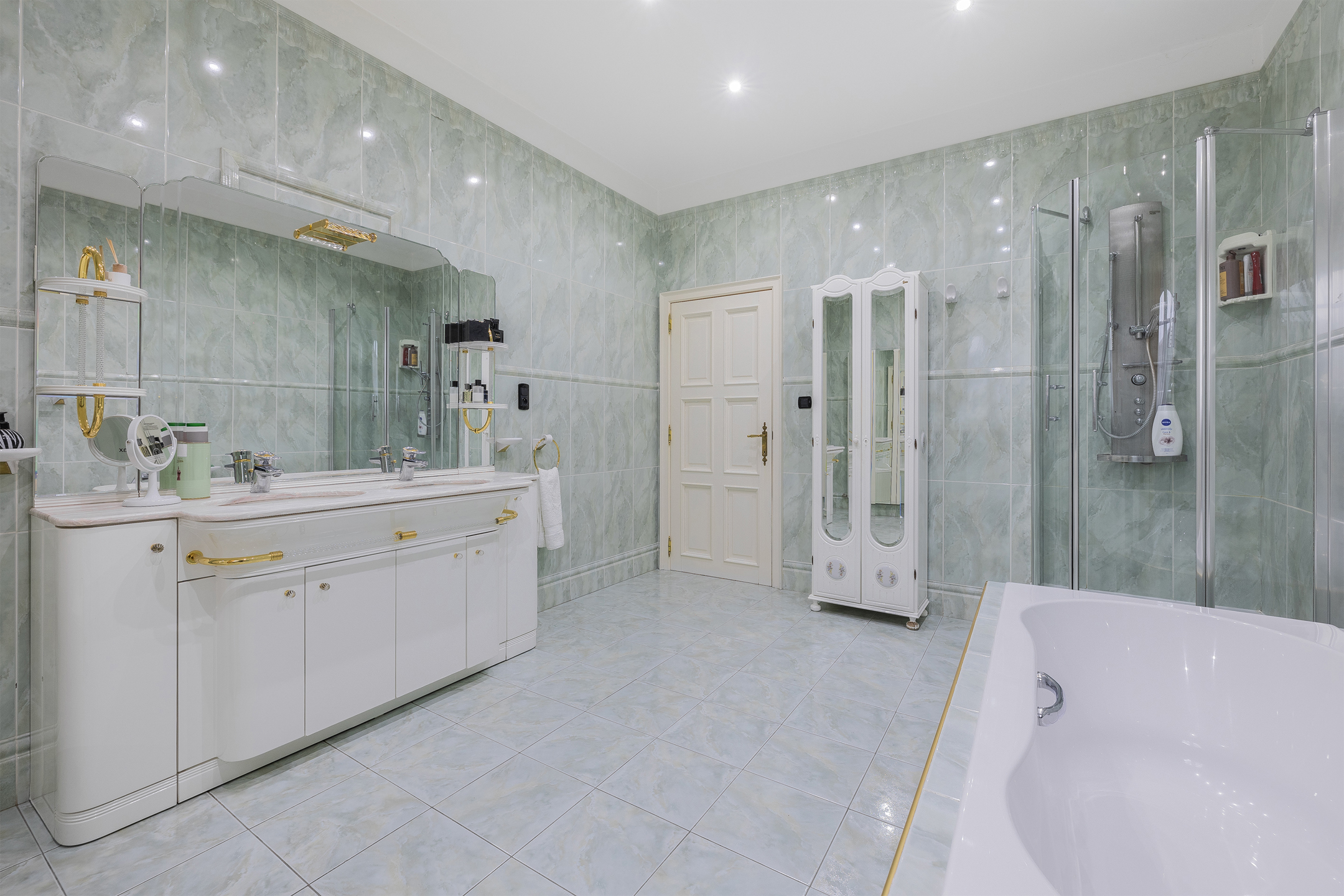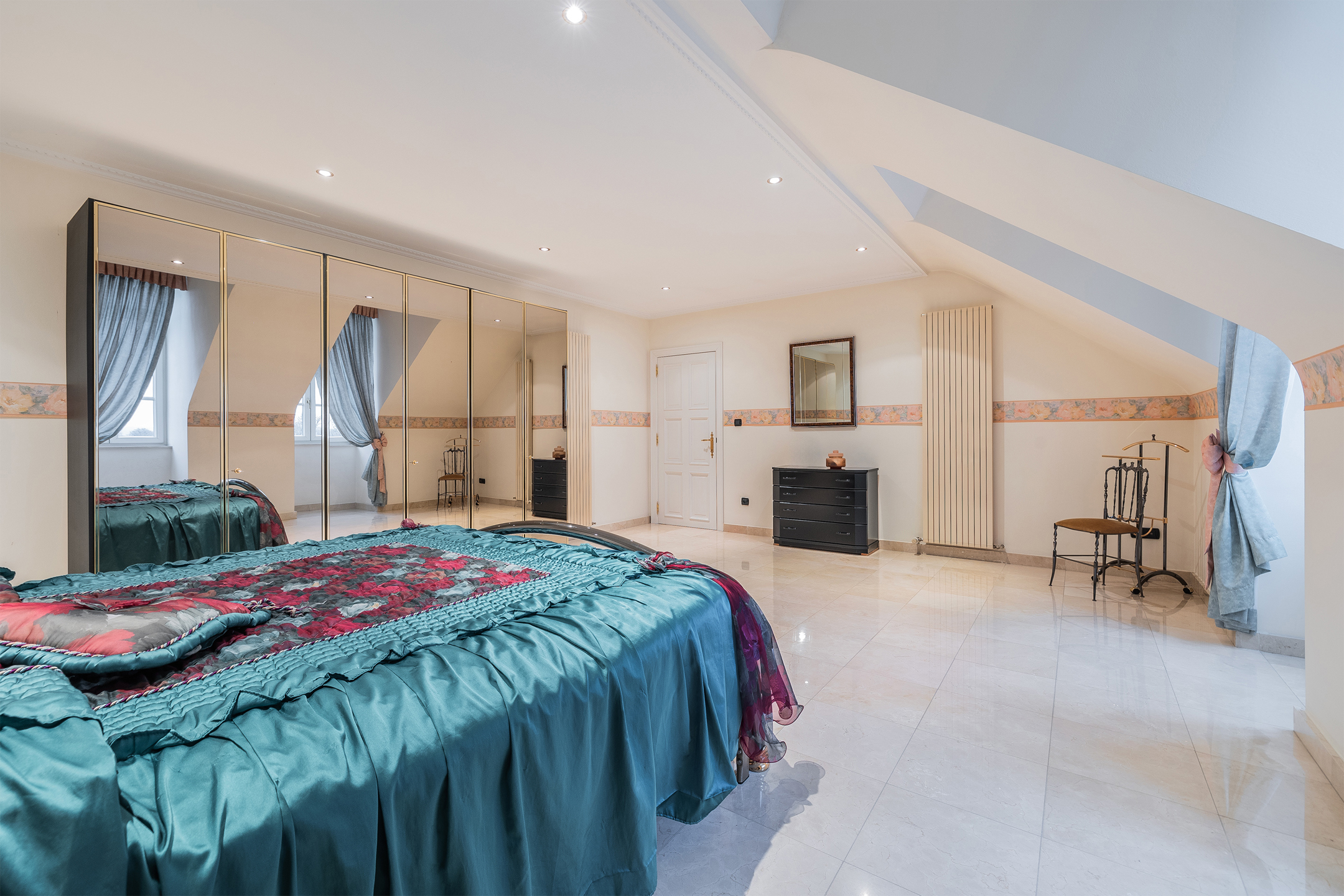 Le rez-de-chaussée vous accueille par un hall d'entrée majestueux avec un escalier bifurqué en pierre naturelle. Vous y trouverez un vaste living de 60 m² équipé d'une climatisation et d'une cassette au feu de bois, une grande cuisine Siematic super équipée orientée sud-ouest, un bureau séparé, une buanderie, une salle de bains avec baignoire, douche, WC, bidet et double vasque, ainsi qu'un WC indépendant. Un garage double avec portes automatiques complète ce niveau.